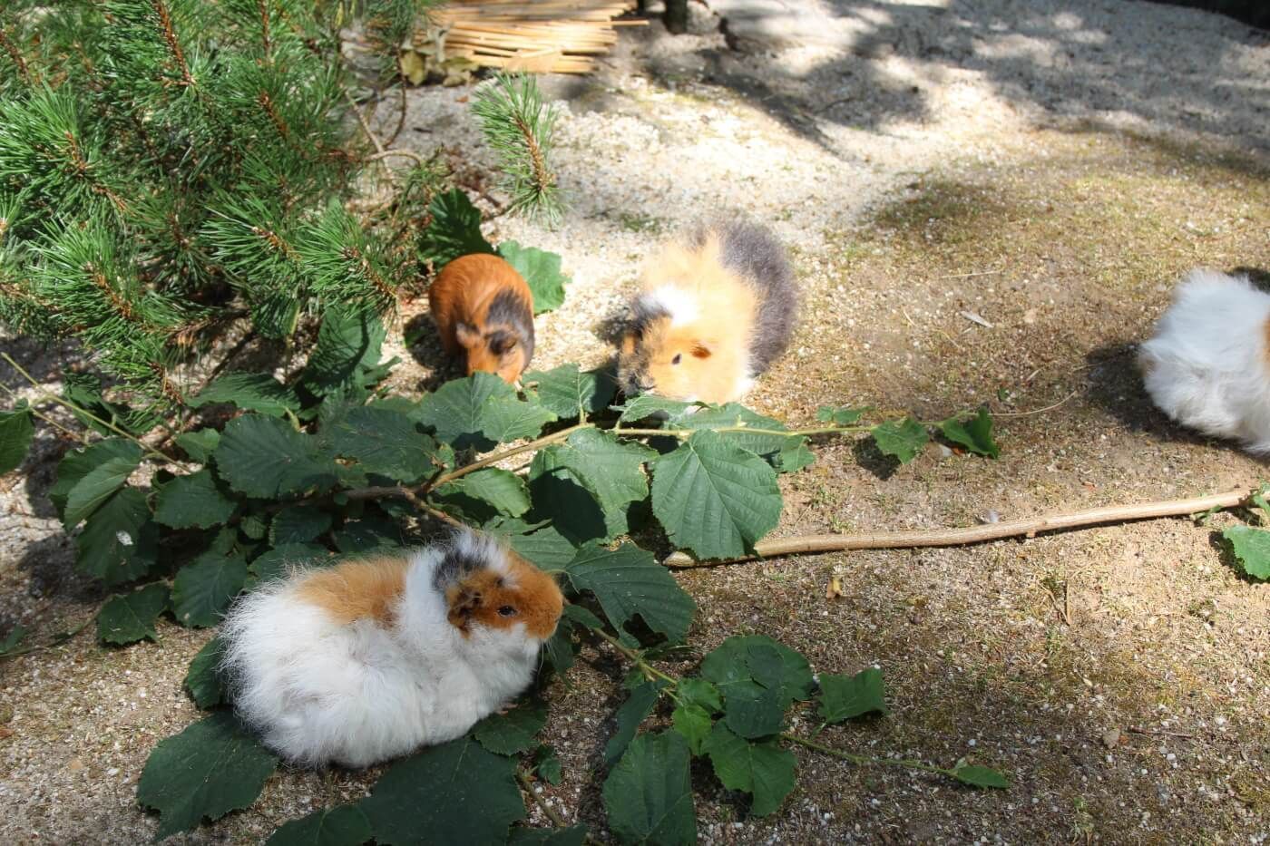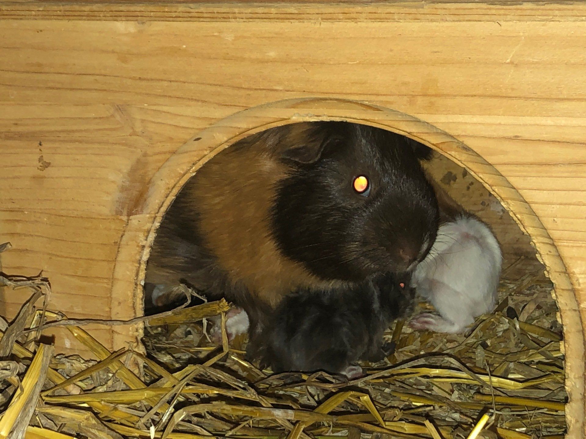 Heute morgen kurz vor dem Frühstück gegen 8:00 Uhr haben die ersten Babys, welche bei uns in der Notstation geboren wurden, das Licht der Welt erblickt. Noch nass und verknautscht schauten sie vorsichtig aus dem Häuschen Richtung Gurkengeber. Mama Sprays war schon verfressen wie eh und je vorne am Stall und forderte ihr wohlverdientes Futter ein. Die 4 Kleinen sind wohl auf, zwei sind etwas kleiner, aber sie laufen am Abend schon der Mama hinterher. Es sind drei Jungs und ein Mädchen, soweit erkennbar. Die Gewichte liegen zwischen 59 und 95 g. Die Zeit wird wie im Fluge vergehen und die Kleinen können sich mit 5 Wochen auf die Suche nach einem eigenen Zuhause machen. Noch vor 300g müssen die Jungs frühkastriert werden, nur so können sie nicht Mama oder ein anderes Weibchen decken. Meerschweinchenbabys sind also wirklich frühreif. Daher die Frühkastration mit 250-300g unter 5 Wochen. Da waren die Kleinen 10 Wochen in Mamas Bauch und draußen geht dann alles so schnell. Mama Sprays hat nun ihre letzte Aufzucht vor sich, sie ist darin ja leider schon sehr geübt. Unterstützung bekommt sie im momentanen Kindergarten von der zweiten Mama und ihren 3 Wochen alten Babys, sowie deren älteren Tochter. Diese Mama und ihre Tochter sind auch wieder tragend. Dh der Kindergarten bleibt uns noch eine Weile erhalten.